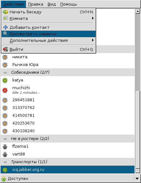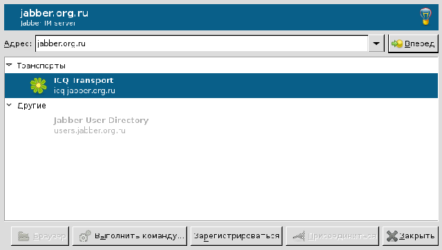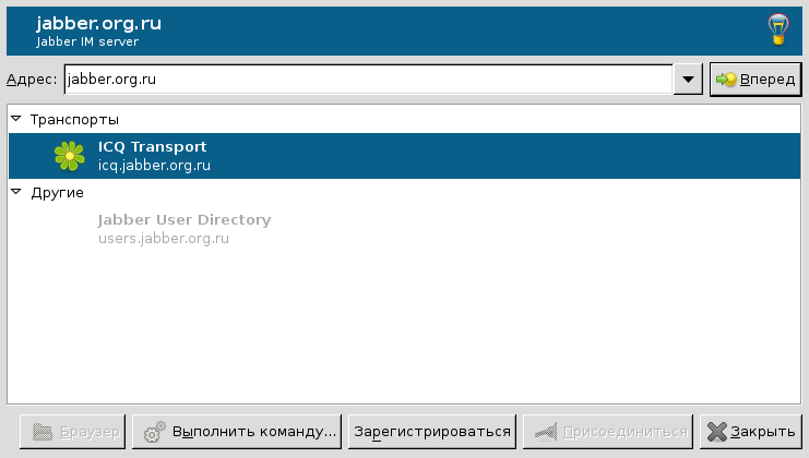 - вбиваем адрес jabber.org.ru или icq.jabber.org.ru или любого другого где имеется icq транспот