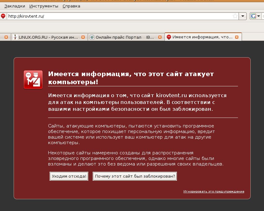 Вот так, скупость в развитии собственного сайта привела к тому, что сайт находится в чёрных списках поисковиков и даже FF3.5.2 отказывается его открывать, очень весело получилось