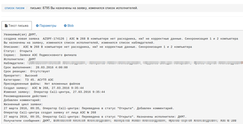 - система ежеминутно синхронизируется с внешними источниками данных (почтовыми ящиками) от службы рассылки заявок "ИнтраСервис"