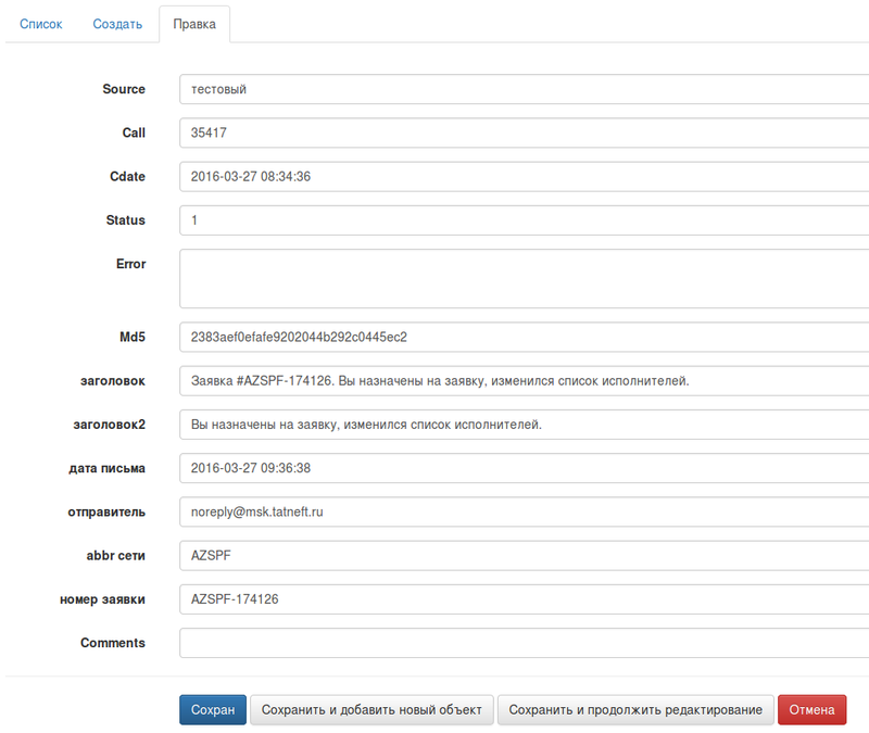 - редактирование данных заявки возможно как в панели управления так и с помощью специальных форм управления, ограниченных с помощью ролей пользователей