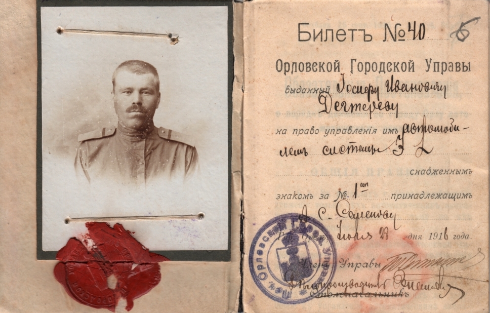Вятка впервые увидела автомобиль 18 февраля 1906 года, сто десять лет назад. А вот самые ранние права на управление автомобилем обнаружены в фондах Государственного архива социально-политической истории Кировской области. Правда, выданы они были не в Вятке, а в г. Орле в 1916 году, 100 лет назад. Уже само наличие водительского удостоверения в тот период — это редкость. В России первое водительское удостоверение было выдано в 1900 году в Санкт-Петербурге. Для получения прав требовалось окончить курсы вождения, которые часто организовывались при автомастерских. Билет № 40 или водительское удостоверение принадлежал Дегтереву Иосифу Ивановичу, ефрейтору царской армии, шоферу полковника. Водительское удостоверение представляет из себя книжку, в которой имеется фотография владельца, закрепленная сургучной печатью и суровой ниткой. В самом документе указаны сведения о владельце. Большой раздел книжки - это «Обязательные постановления о порядке движения автоматических экипажей».