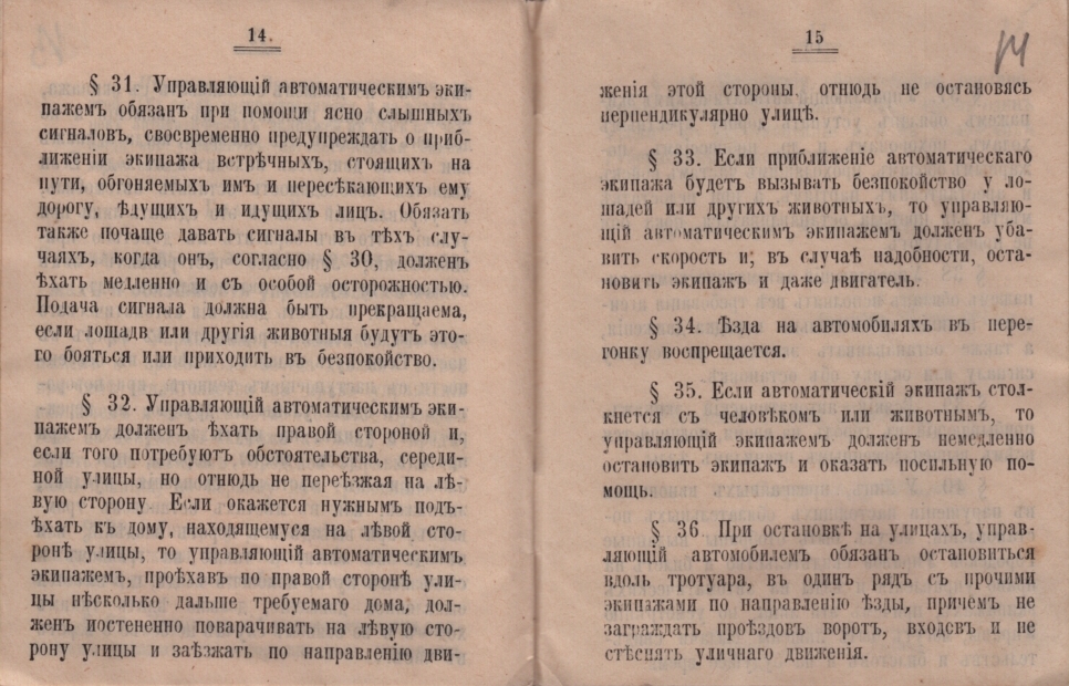 Вот некоторые выдержки из Постановления. «Автоматические экипажи» могут двигаться по городу после ежегодного техосмотра. Лица, управляющие автомобилем, должны допускаться к управлению после испытаний. Сам автомобиль должен быть сделан надежно, иметь два независимых друг от друга «тормозных приспособлений», исходящие пары или газ не должны причинять неудобства прохожим. «Свидетельство о допущении автоматического экипажа к езде» всегда во время езды должно находиться при экипаже и предъявляться агентам Городской Управы и чинам полиции по первому их требованию. Разрешение на управление автоматическим экипажем выдается «лицам не моложе 18 лет, грамотным, умеющим объясняться по-русски, имеющим слух и зрение не ниже нормального и не обладающими физическими недостатками, мешающими управлять автоматическим экипажем». Самая большая глава Постановления посвящена «Правилам езды на автоматических экипажах и обязанностям управляющих ими». Любопытно, что скорость движения не должна была превышать 12 верст в час, а на грязном и скользком пути, перекрестках улиц и крутых спусках, наконец, везде, где имеется оживленное движение, «должно ехать тихим ходом и во всяком случае не более 5 верст в час» (одна верста соответствует 1,067 км), «если приближение автоматического экипажа будет вызывать беспокойство у лошадей или других животных, то управляющий автоматическим экипажем должен убавить скорость и, в случае надобности, остановить экипаж и даже двигатель».