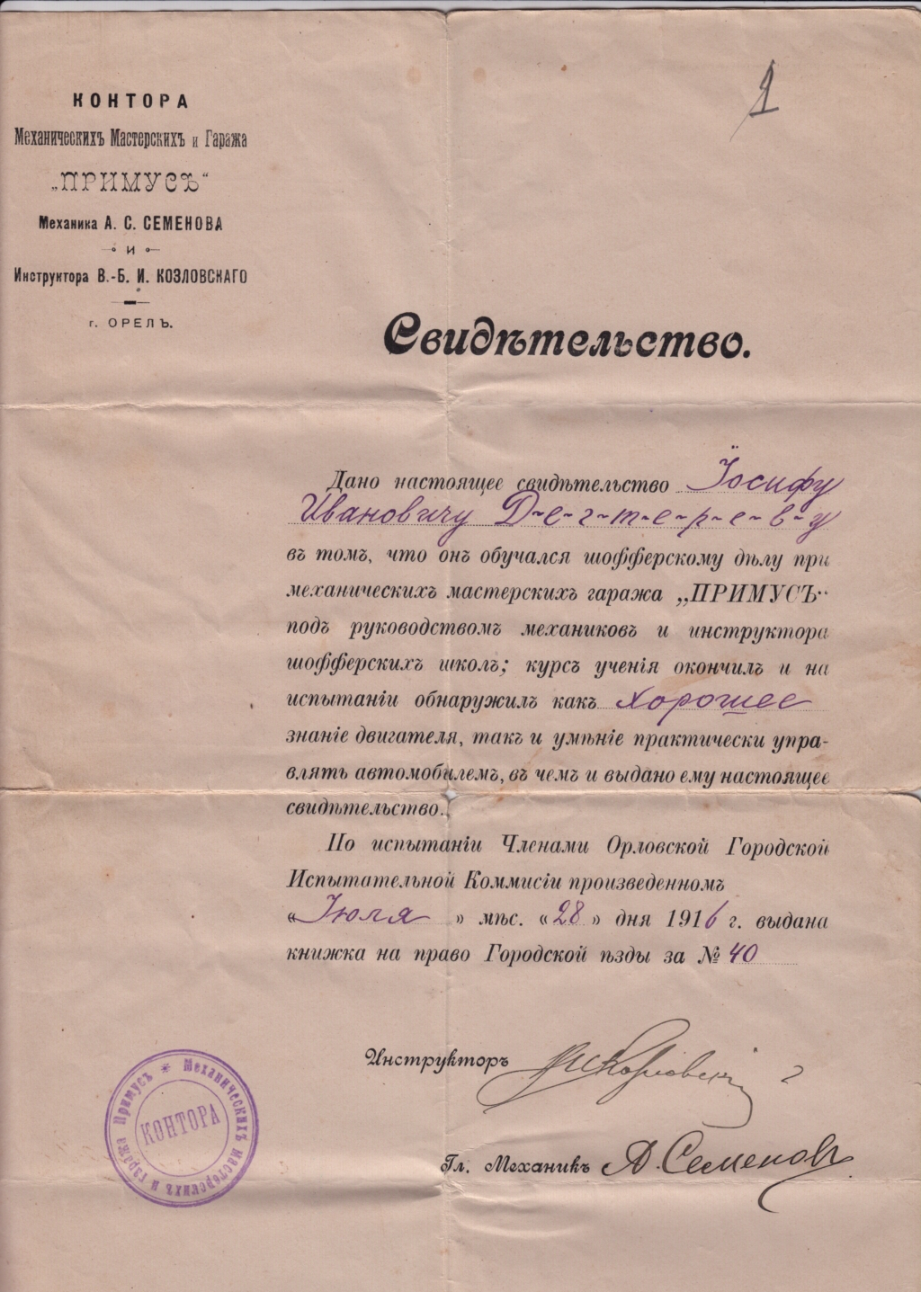 Накануне этой даты в Государственном архиве социально-политической истории Кировской области был найден интереснейший документ - водительское удостоверение 1916 года.